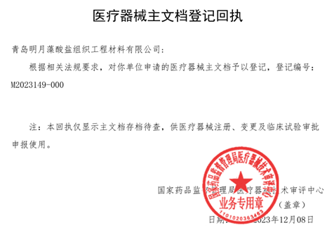 日前,青島明月藻酸鹽組織工程材料有限公司提交的《海藻酸鈉原材料主文檔》在國家藥品監督管理局醫療器械技術審批中心獲得主文檔登記號M2023149-000。