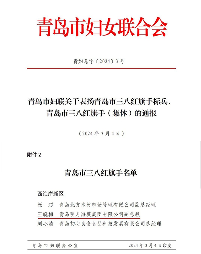 近日,青島市婦女聯(lián)合會(huì)發(fā)布《關(guān)于表揚(yáng)青島市三八紅旗手標(biāo)兵、青島市三八紅旗手(集體)的通報(bào)》,其中,青島明月海藻集團(tuán)有限公司副總裁王曉梅同志獲評(píng)青島市三八紅旗手榮譽(yù)稱號(hào)。
