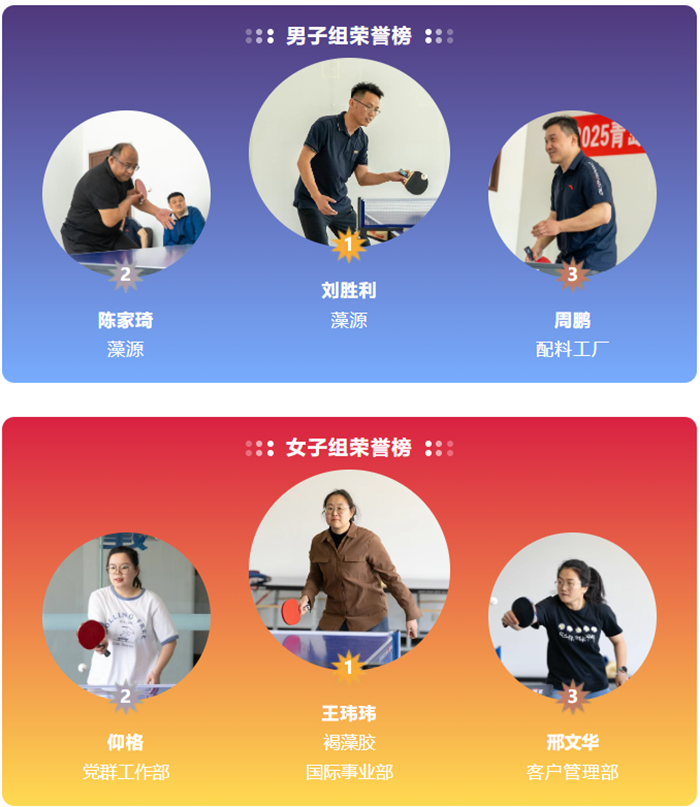 4月28日,集團辦公大樓一樓及五樓乒乓球活動室內賽事氛圍熱烈。為確保公平公正,本次比賽特邀請區總工會工人文化宮協辦,并由專業裁判全程執裁。男子組、女子組單打比賽在此拉開帷幕,數十名職工揮拍上陣。賽場上,選手們發球精準、扣殺凌厲,直拍與橫拍的較量、攻守轉換間盡顯精湛球技,引得觀眾陣陣喝彩。決賽階段,選手們更是克服種種困難,以酣暢淋漓的鏖戰展現頑強斗志。最終,經過多輪激烈角逐,男子組冠軍由藻源國內事業部劉勝利斬獲,女子組冠軍則由褐藻膠國際事業部王瑋瑋摘得。