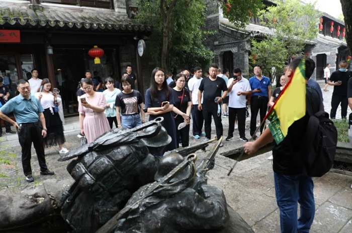 走進臺兒莊古城,處處都是古河道、古碼頭,舟楫搖曳,水巷縱橫,當地的村民筑臺而居,大家立刻被濃厚的運河文化深深吸引,先后參觀了運河奏疏館、運河酒文化展館、運河漕幫鏢局博物館、藥典博物館、藻食記輕食文化館,形象直觀地了解了古運文化的源遠流長和老臺兒莊的風土人情。