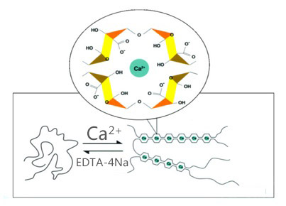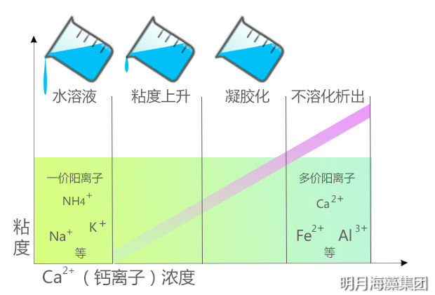 海藻酸鹽遇到鈣離子可迅速發(fā)生離子交換,生成凝膠,其凝膠具有熱不可逆性。高G型海藻酸鹽生成的凝膠硬度大但易碎;高M(jìn)型海藻酸鹽生成的凝膠則相反,柔韌性好但硬度小。調(diào)整兩種比例可生產(chǎn)不同強(qiáng)度的凝膠。利用凝膠特性,可用于制作各種仿生食品、用材料、面膜、廢水處理劑、保鮮膜等。